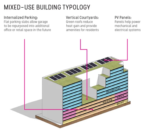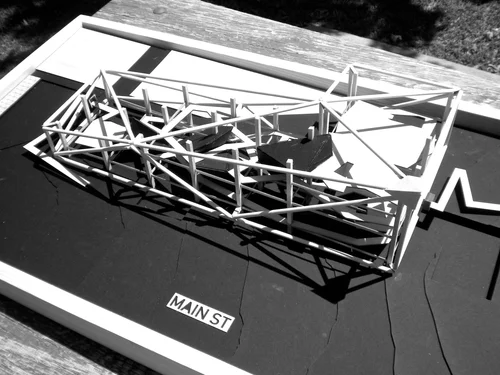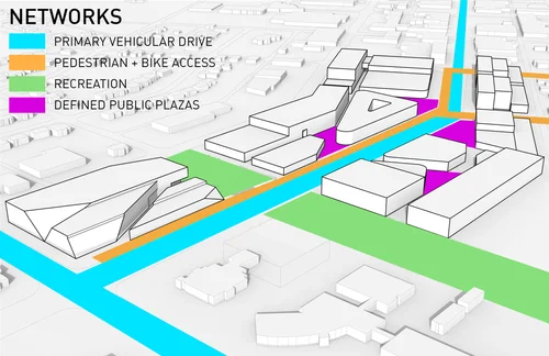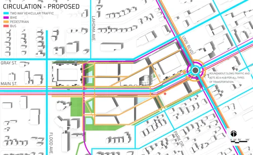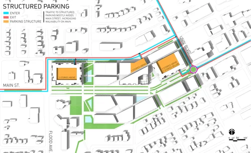 Study of existing traffic patterns revealed that many drivers come to Main Street from the East and leave to the East, or come from the West and leave to the West. Structured parking at each end of the site serves this pattern.