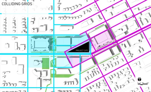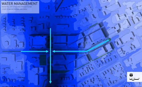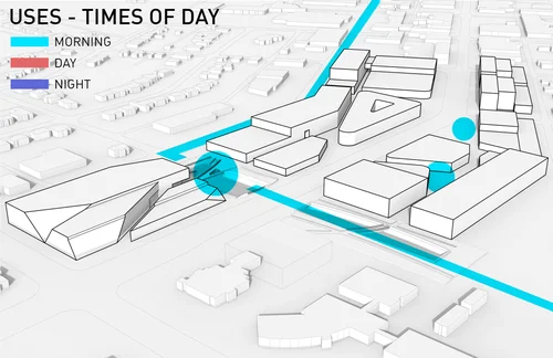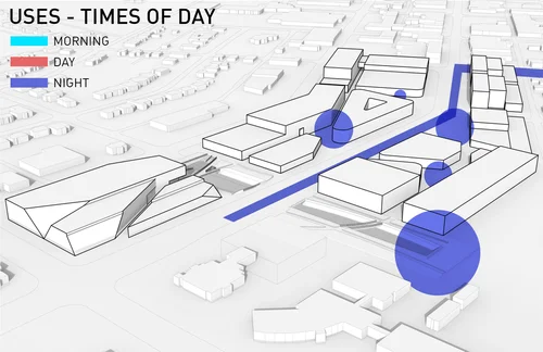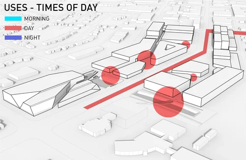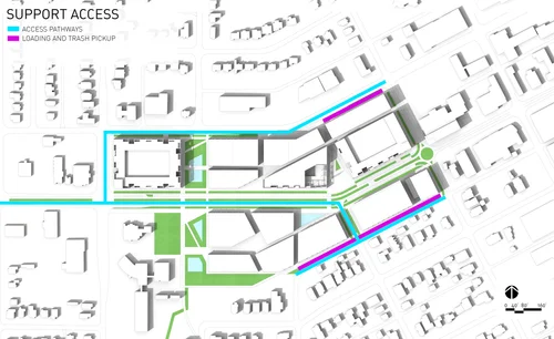 This project was done with a group of three other students. I produced all of the graphics shown here. Site design began with analysis of existing conditions and diagrams of how those conditions could be adapted to create a more dynamic, pedestrian-friendly environment.